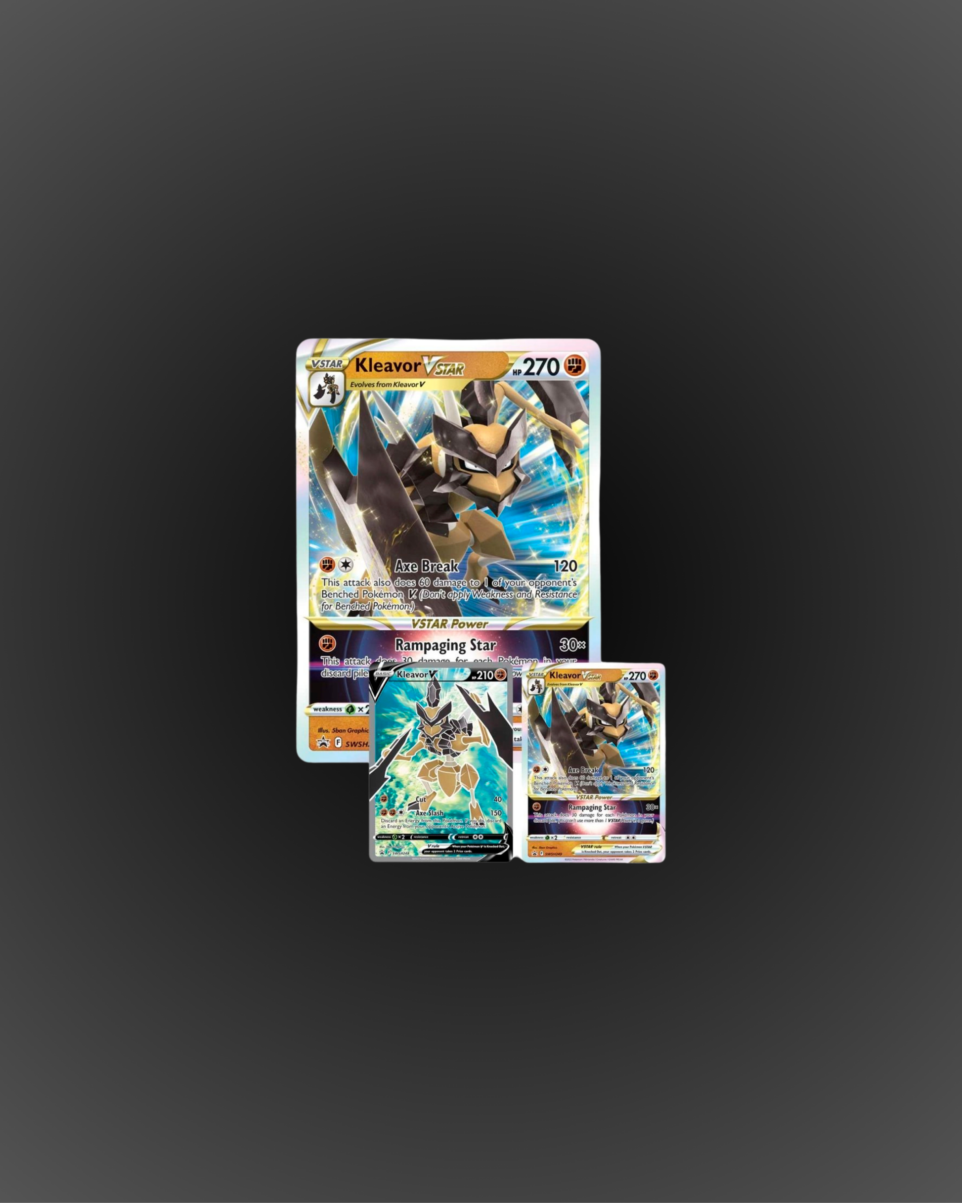Kleavor VSTAR slashes and crashes its way out of the wilderness and into your deck with both arms swinging! This powerful Pokémon VSTAR can do more damage for each Pokémon in your discard pile, so your opponent should tread lightly. Both Kleavor VSTAR and Kleavor V are here as playable foil promo cards, along with an oversize card, glossy enamel pin, shimmering coin, and booster packs with more cards to complete your strategy. Watch out—Kleavor VSTAR is ready to rampage!