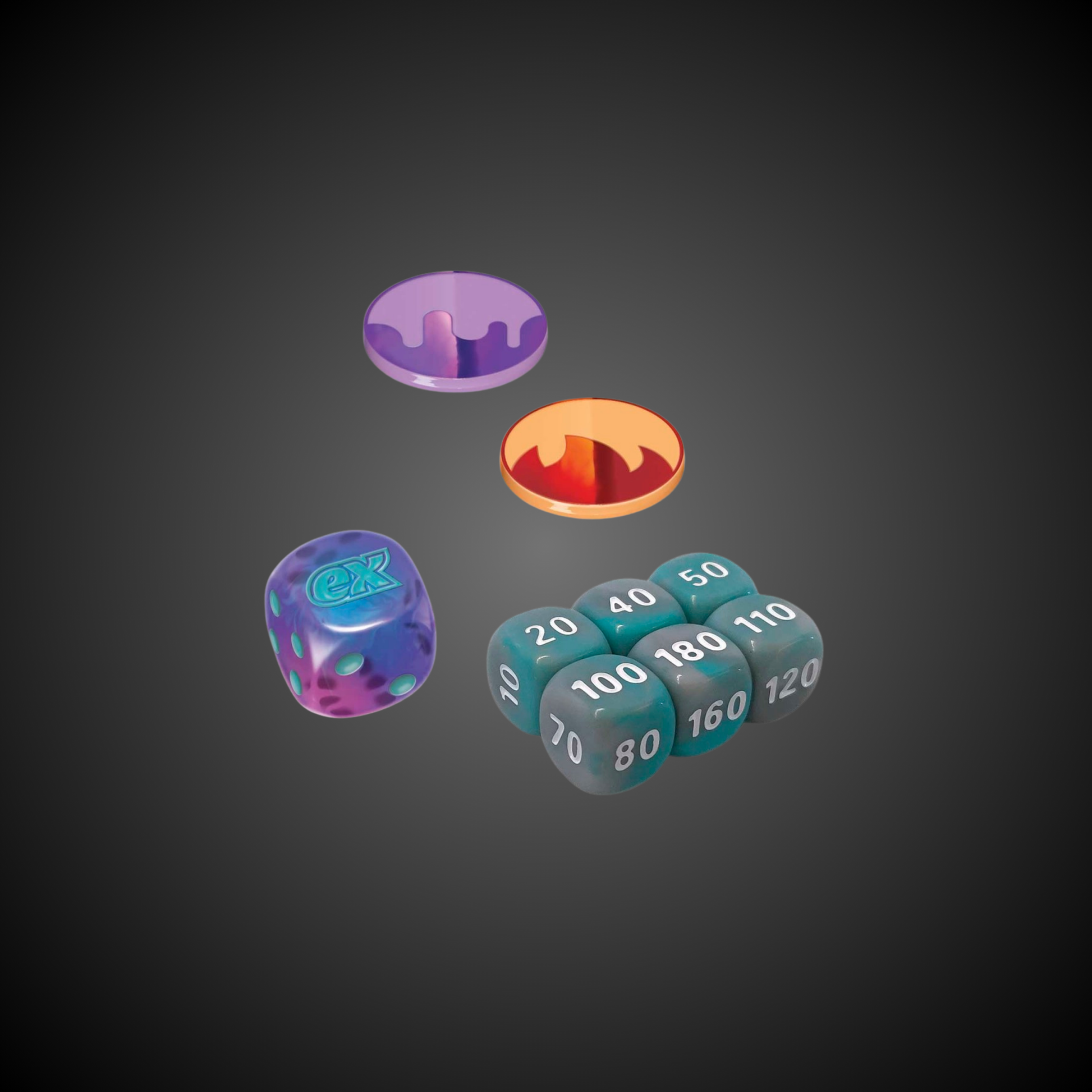 • 6 damage-counter dice, 1 coin-flip die, 2 condition markers